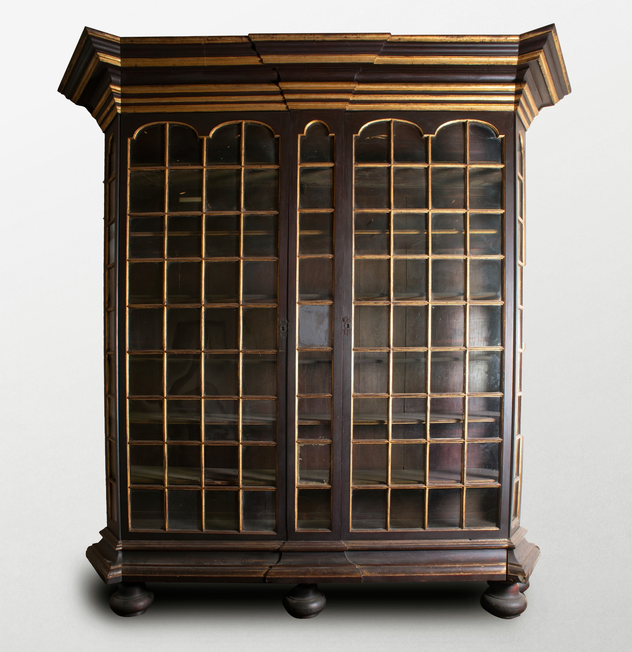 These two teak book cabinets were crafted in Batavia in 1747 to store official archives. Each cabinet features double glass-paneled doors, once fitted with multiple small panes- some of which are now missing. The cabinets rest on five rounded feet, with a wooden board connecting them for stability. Beneath the dark brown finish, traces of red lacquer and gilding remain visible, suggesting their original decorative elegance.