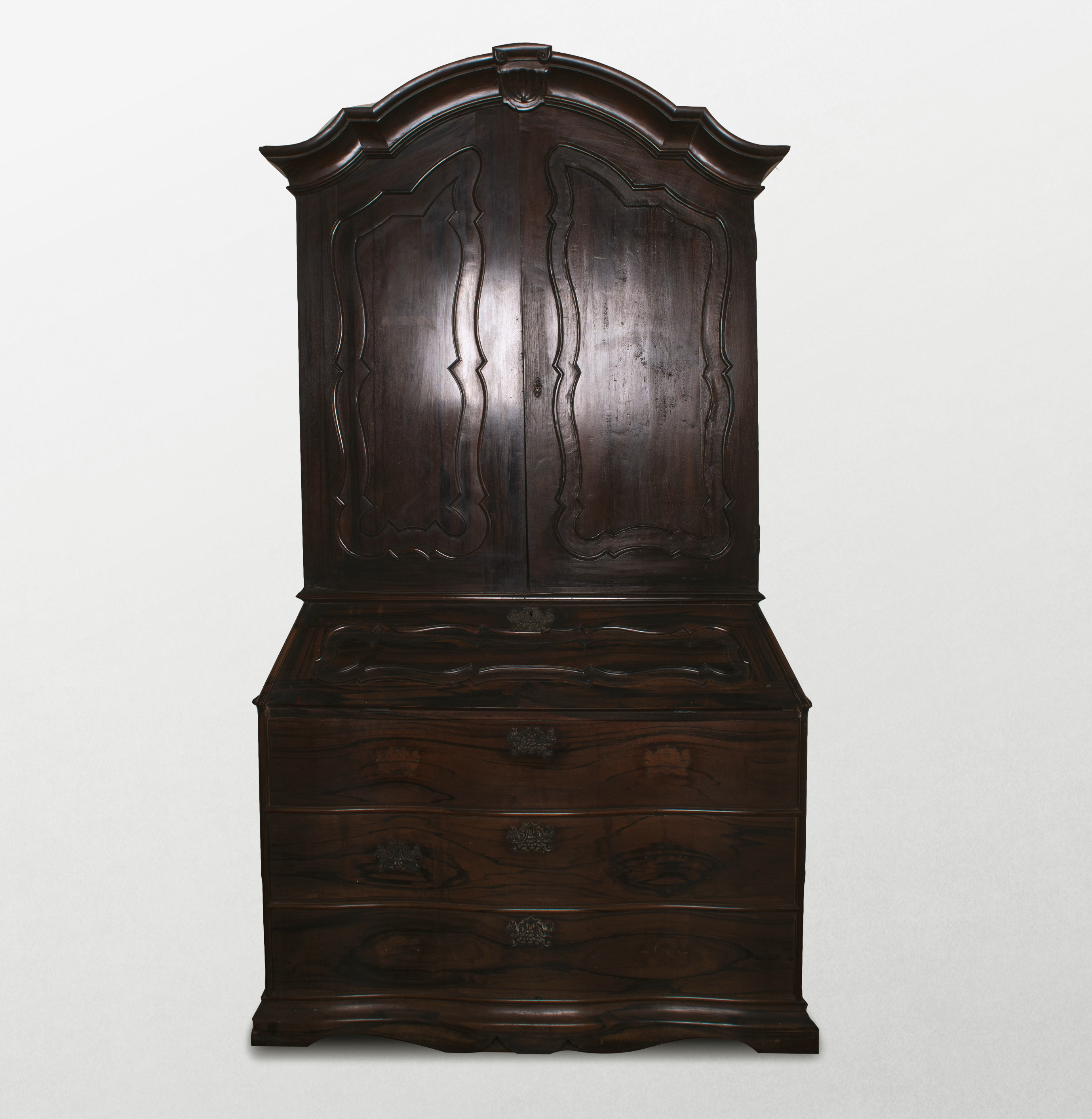 Its scalloped crest with a shell motif, delicate brass star pulls, and concealed writing surface reveal both elegance and purpose, blending Dutch colonial design with South Asian artistry. Gifted to the Royal Batavian Society Museum (Koninklijk Bataviaasch Genootschap Museum) by Governor-General Tjarda van Starkenborgh Stachouwer in 1941, the bookcase reflects the circulation of materials, motifs, and administrative culture between Sri Lanka, Java, and Europe at the height of Dutch East India influence.