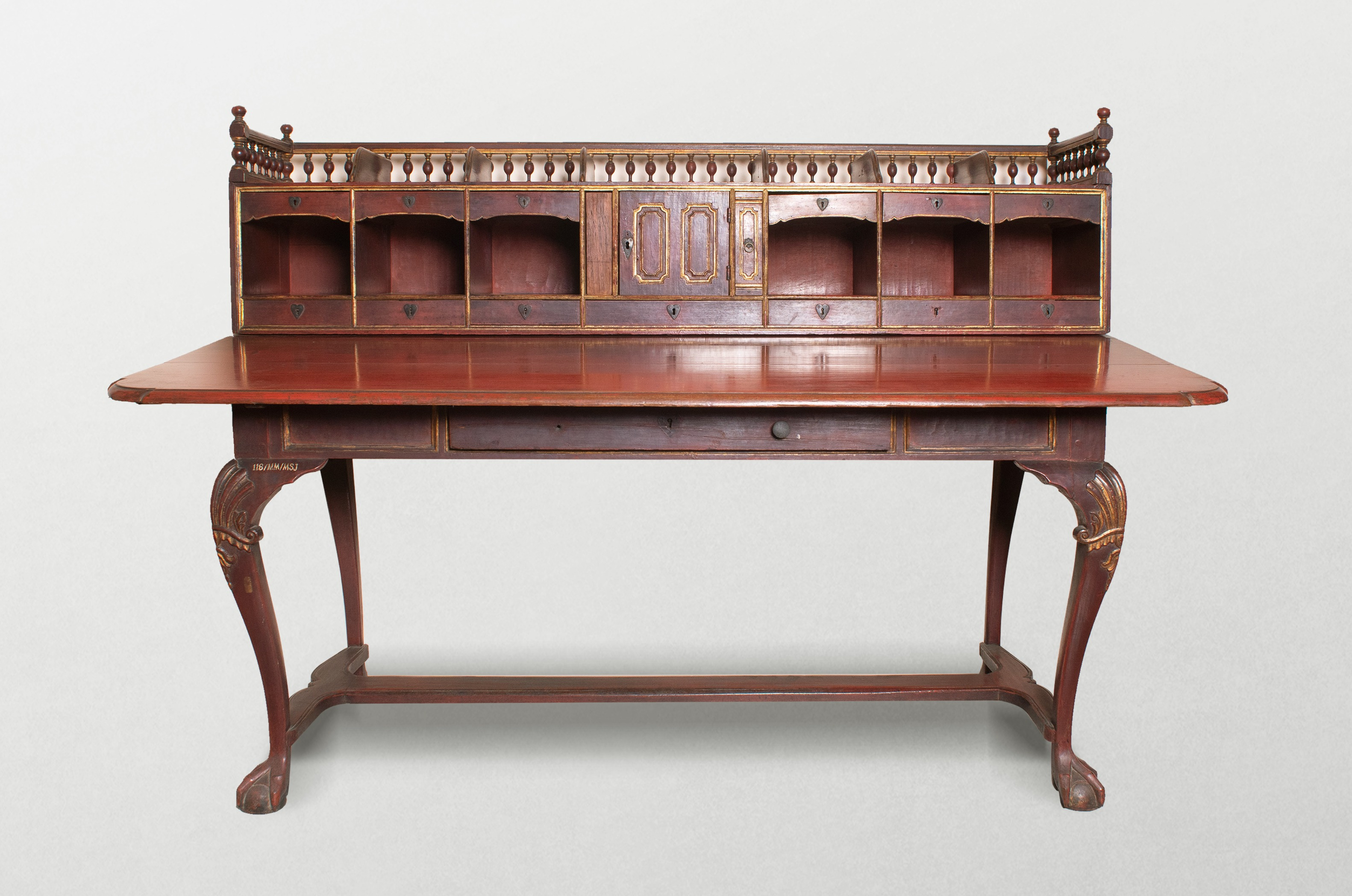 The desk’s reddish lacquer and gold trim show the fusion of European and Asian aesthetics characteristic of 18th-century Batavian design, reflecting the influence of Hokkien-Chinese craftsmen active in the city. Its gently inclined surface, rising from 77 cm to 82 cm, made long hours of writing more comfortable. The upper rack provided space for correspondence and documents, balancing practicality and elegance.